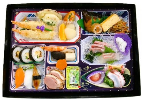 内容: にぎり寿司、巻寿司、ぶり照焼き、天ぷら、刺身、煮物、果物など。 アレルギー表示: 原材料の一部にえび・小麦・卵・乳成分を含む 容器サイズ:縦32cm x 横43cm ※お刺身は別容器になります。