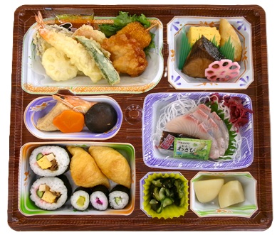 内容: 巻寿司、いなり寿司、ぶり照焼、鶏唐揚、海老天、刺身、煮物など。 アレルギー表示: 原材料の一部にえび・小麦・卵・乳成分を含む 容器サイズ:縦29cm x 横33cm ※お刺身は別容器になります。